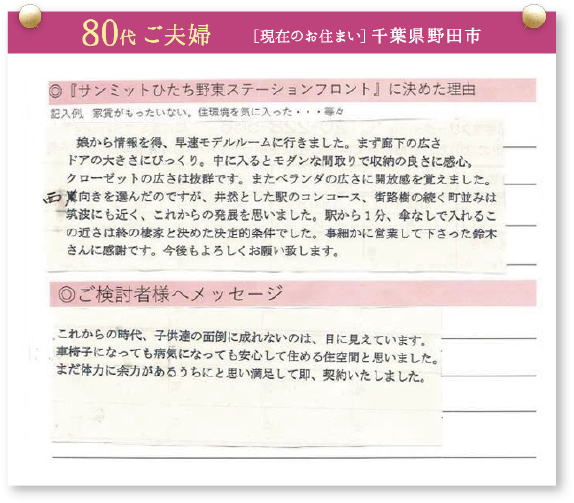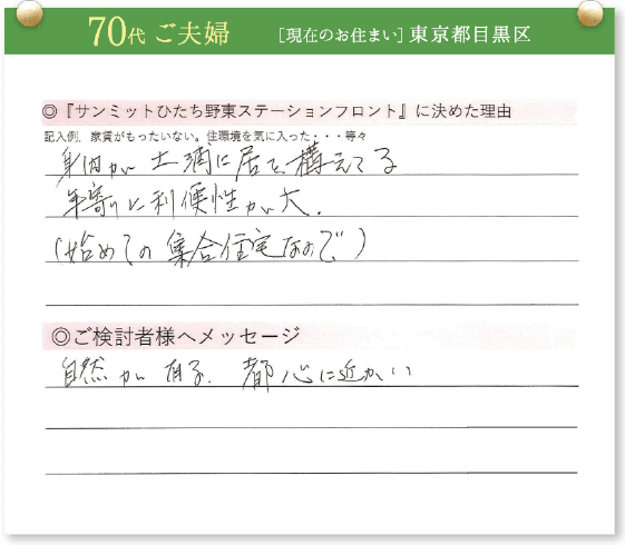 「サンミットひたち野東ステーションフロント」をご契約いただいた皆様に契約を決めた理由を伺いました。