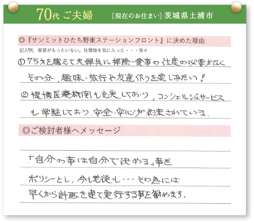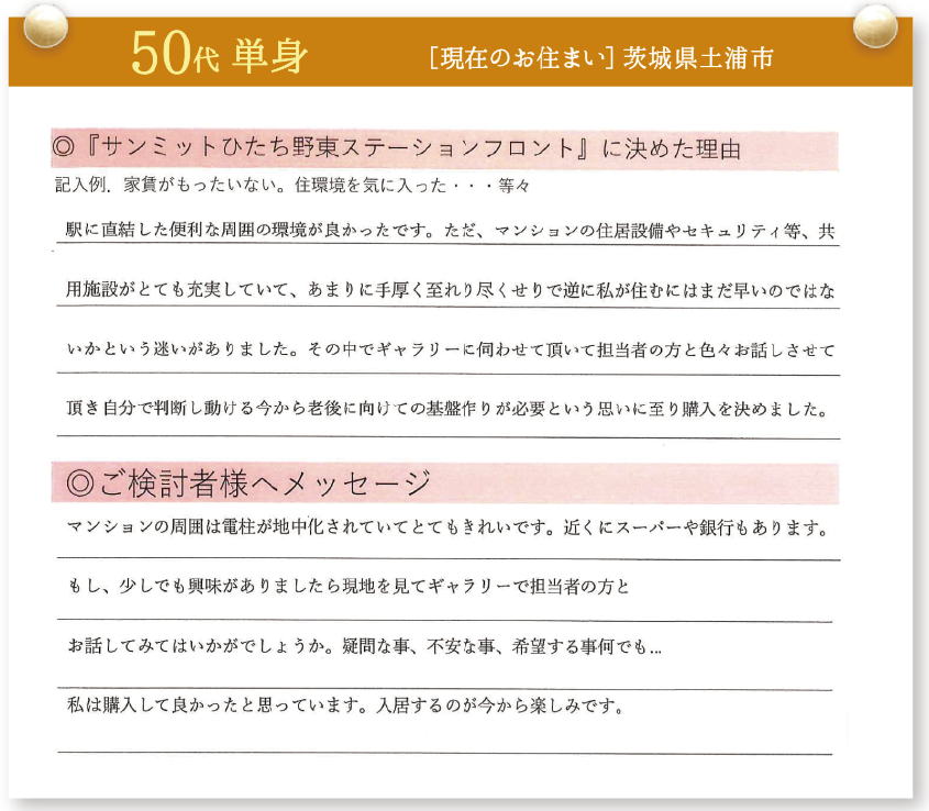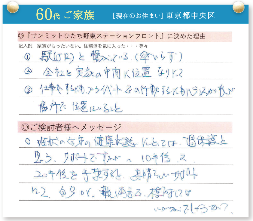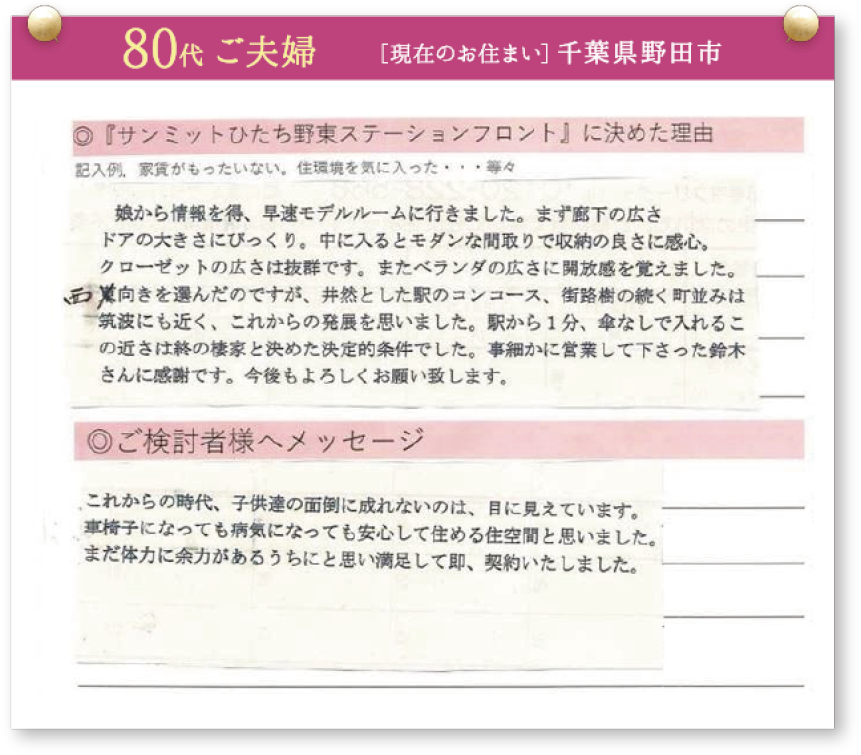 「サンミットひたち野東ステーションフロント」をご契約いただいた皆様に契約を決めた理由を伺いました。